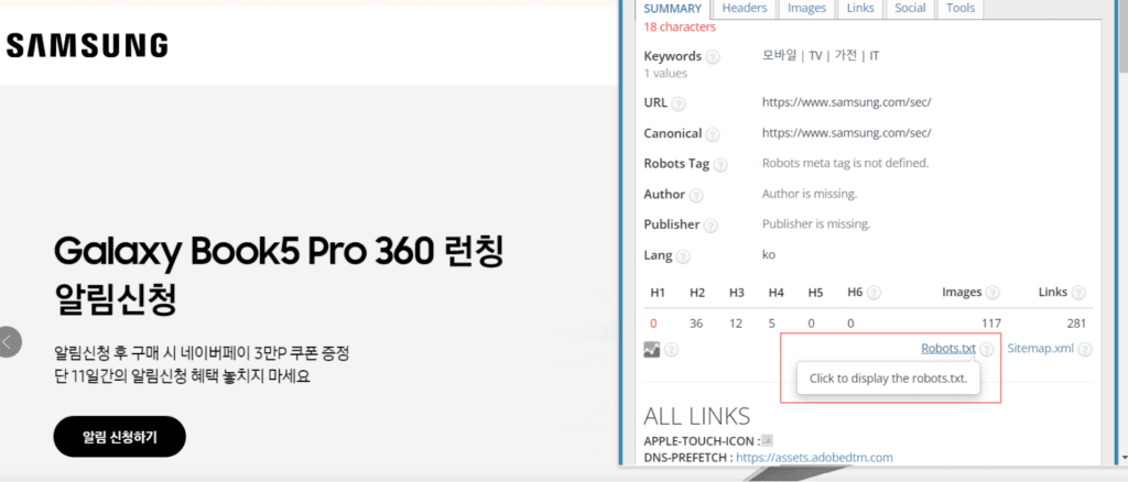 예를 들어 삼성에 가서 확장 프로그램으로 어떤 Robots.txt 를 설정했는지 확인해보면