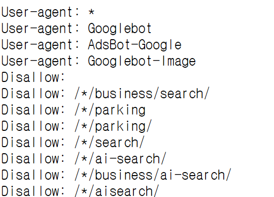 /business/search/ , /parking/ 등 특정 페이지들은 검색 결과 노출을 막아두었다.