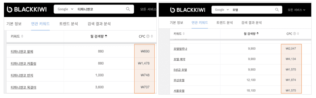 블랙 키위같은 플랫폼에 가서 google 검색 광고 비용을 알아보면