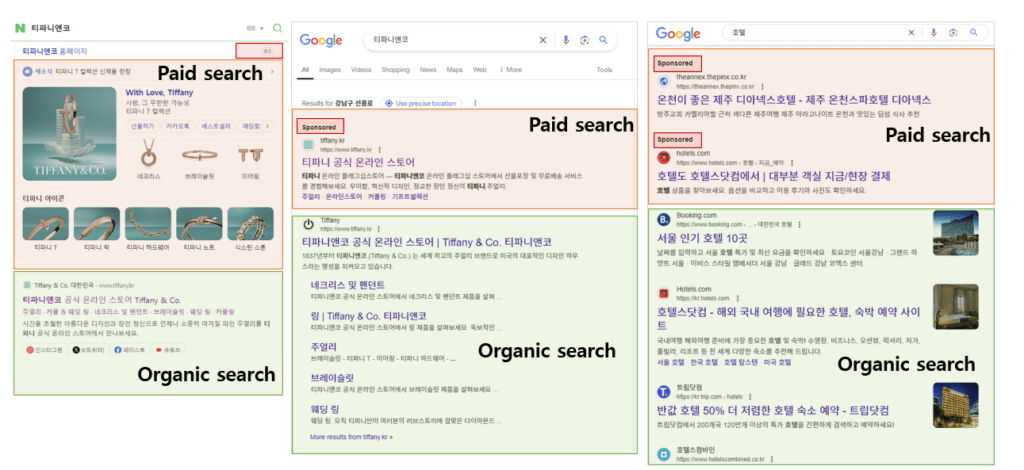 아래처럼 보통 Paid 가 상단에, Organic 영역이 하단에 위치하게 되는데