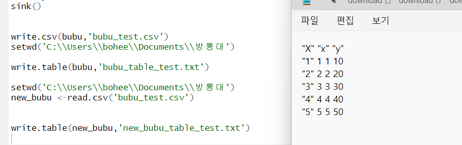 *write.csv() 도 객체를 외부에 저장한다는 점이 비슷하지만 콤마로 구분되고,