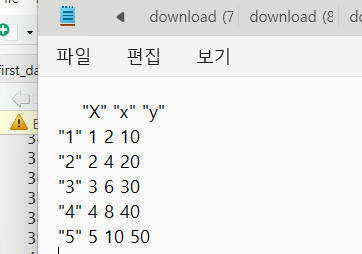 근데 불러오게 되면 변수명이 없던 컬럼에 X 라는 변수명이 자동 할당