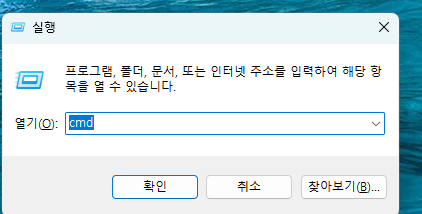 단축키 : 윈도우 + R 누르면 아래와 같은 옵션이 활성화 되고, cmd 를 누르면 터미널로 진입함