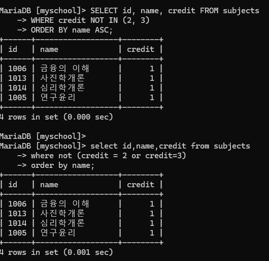 NOT IN 을 비교 연산차로 표현하면 AND 로 처리