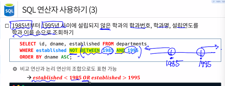 *NOT BETWEEN 은 비교 연산자로 표현할 떄 OR 로 표현