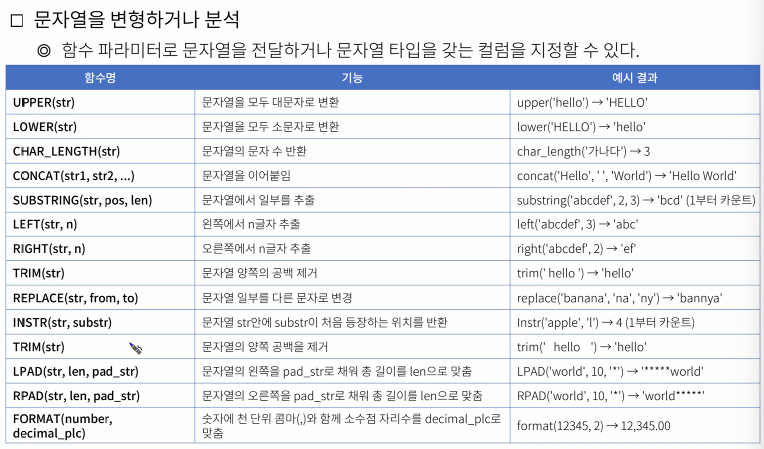 -집계 함수:여러개 행의 값을 하나의 결과로 요약 (SUM,AVG,MAX)