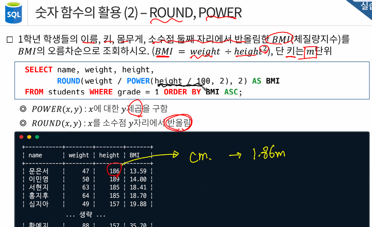 *소수점 첫쨰자리 까지 반올림 한다는 것은 ROUND(height, 1) 로 작성 필요