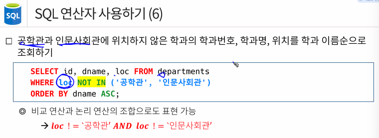 NOT IN 을 비교 연산차로 표현하면 AND 로 처리