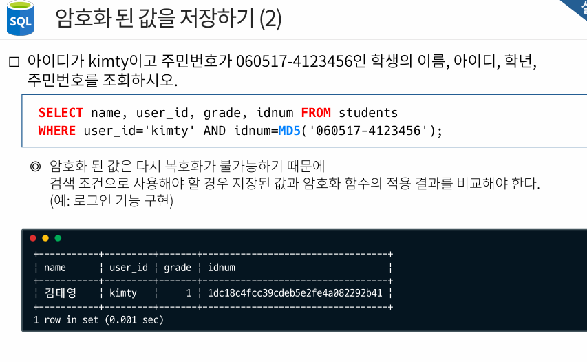 -MD5 로 암호화하여 INSERT 가능하고, WHERE 절에서도 MD5 로 감싸서 조회해야함