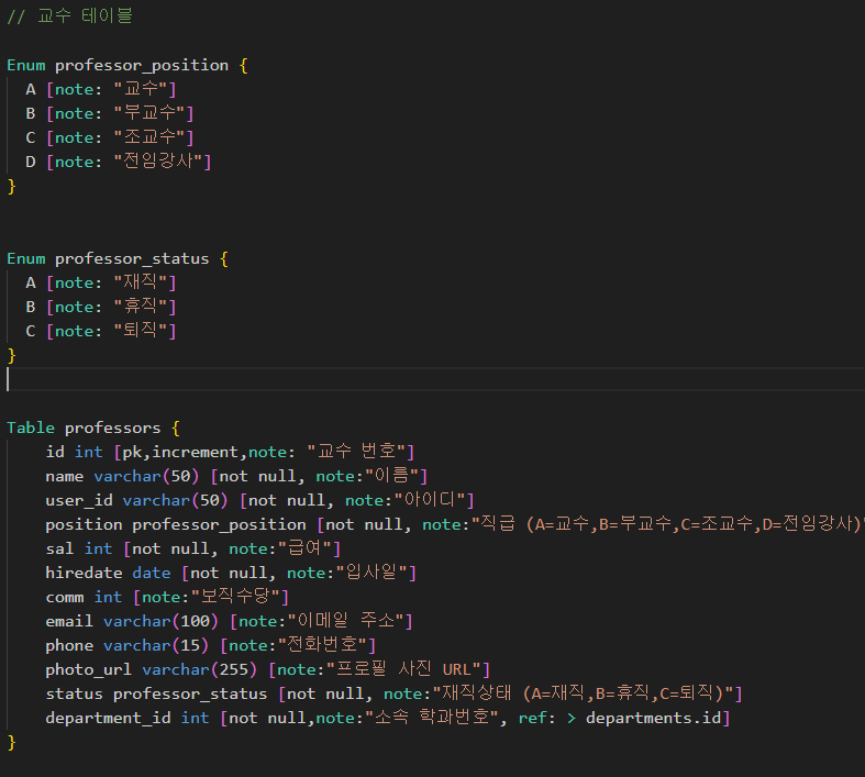 status professor_status [not null, note:"재직상태 (A=재직,B=휴직,C=퇴직)"]