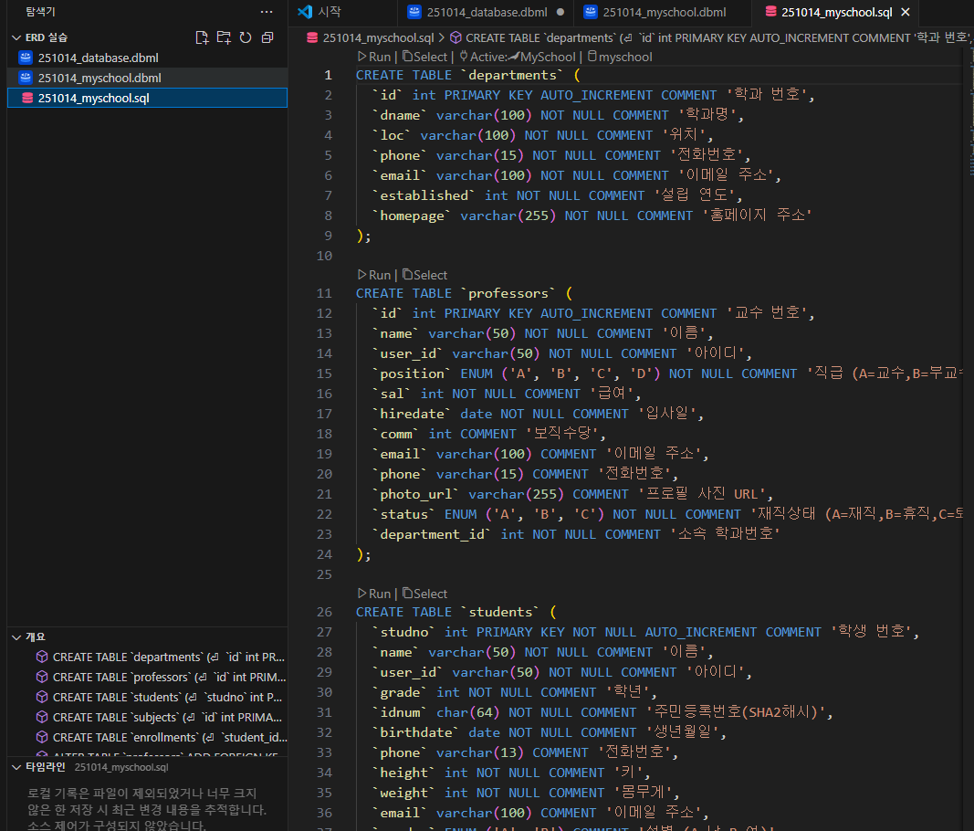 좌측에 새로운 SQL 파일이 생성되고 DBML 구문들이 SQL 구문 형식으로 바뀌어져 있음