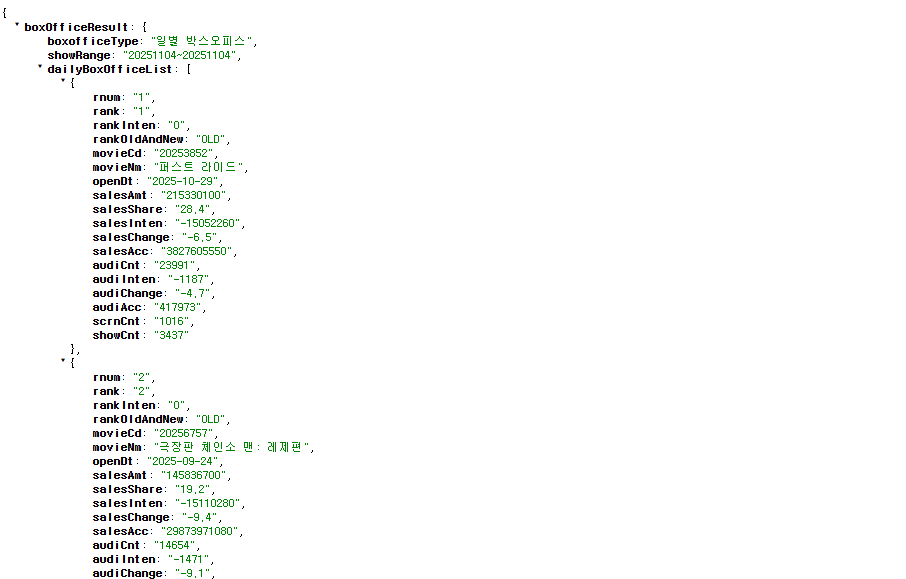 url = "http://www.kobis.or.kr/kobisopenapi/webservice/rest/boxoffice/searchDailyBoxOfficeList.json"