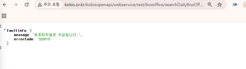 필수 요청값인 key 와 targetDt 를 url 에 추가하여 확인해보면 아래와 같이 원하는 데이터를 확인할 수 있다