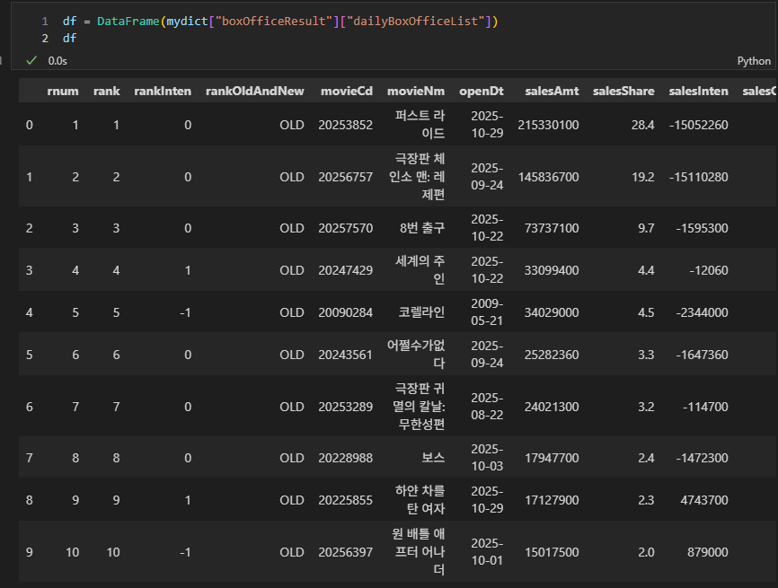 df = DataFrame(mydict["boxOfficeResult"]["dailyBoxOfficeList"])