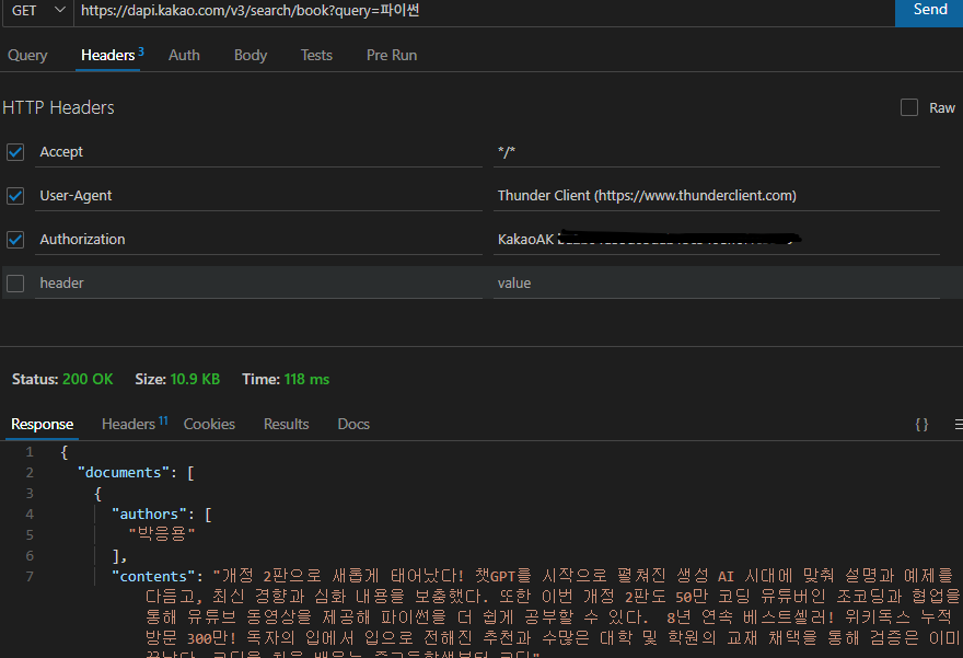2) 요청 시 헤더에 Authorization 에 키 값 송출 필요