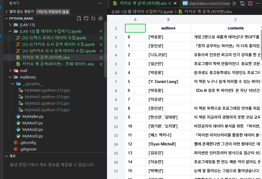 | [아이티윌 빅데이터 52기] LAB 12 | 웹 데이터 수집하기 | 카카오 개발자 API | 책 검색 결과 수집 (0) | 2025.11.05 |