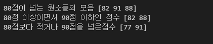 print("점수가 80점 이상인 원소들이 1차원 배열로 출력됩니다 : ",result2)