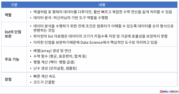 - 만약 어떤 함수에서 파라미터로 리스트를 전송해야하면, 그 떄 ndarray 를 쓸 수 도 있다