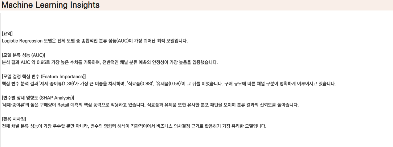 - 데이터 기반 의사결정: 직관이 아닌 SHAP 지표와 실제 수치에 기반하여 어떤 품목이 채널 성격에 영향을 주는지 설명함으로써 조직 내 의사결정의 신뢰도를 높였습니다.