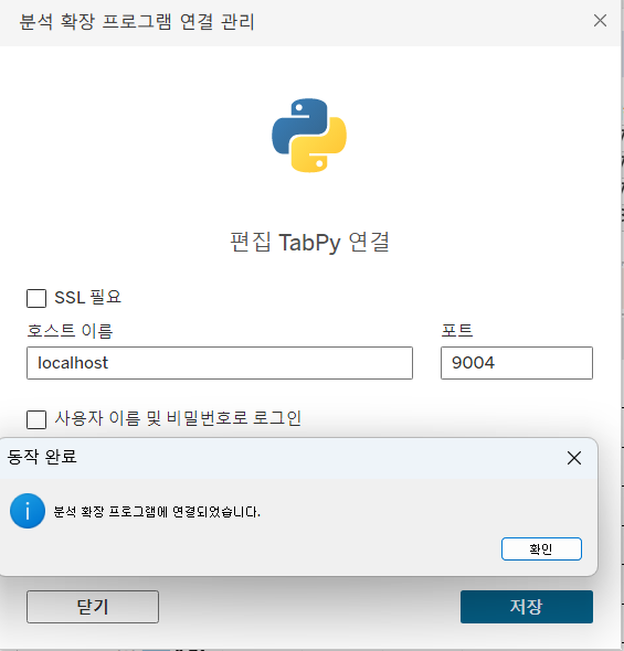 - 서비스 연결: 태블로의 [외부 서비스 연결 관리]에서 TabPy 서버 주소(localhost)와 포트(9004)를 등록.