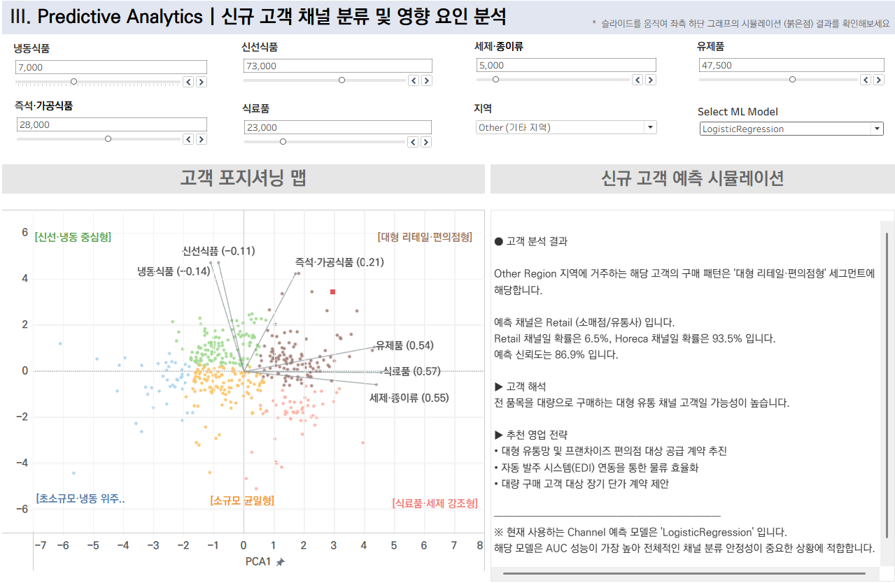 과거 데이터의 사후 분석에 그치지 않고, 대시보드 상에서 신규 고객의 구매 데이터를 입력하거나 필터를 조정하는 즉시 "이 고객은 85%의 확률로 Retail 고객입니다"라는 예측 결과를 받아볼 수 있습니다.