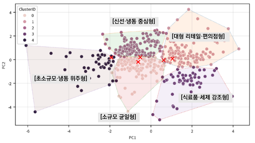 - 의미: 이 품목들을 많이 살수록 모델은 고민 없이 **소매점(Retail)**으로 분류합니다. 특히 '세제·종이류'는 점들의 확산 범위가 가장 넓어 채널을 가르는 가장 강력한 엔진임을 보여줍니다.
