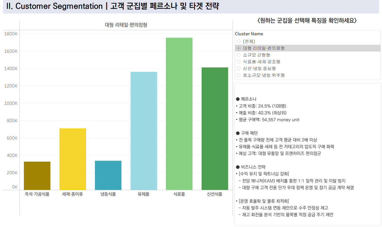 - 맞춤형 프로모션: 가공식품 비중이 높은 '## 고객군에게는 세제 및 종이류 묶음 할인 이벤트를 제안합니다.