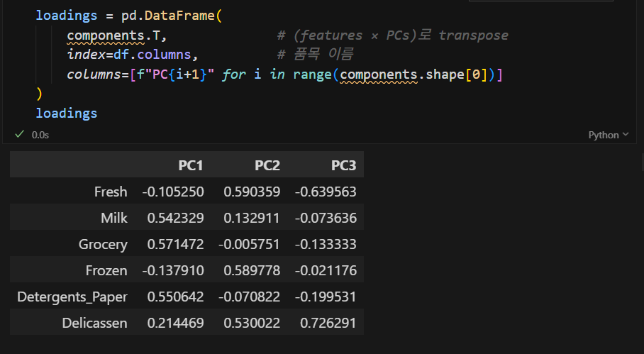 로딩값은 각 품목이 주성분을 형성하는 데 기여한 '성적표'입니다.