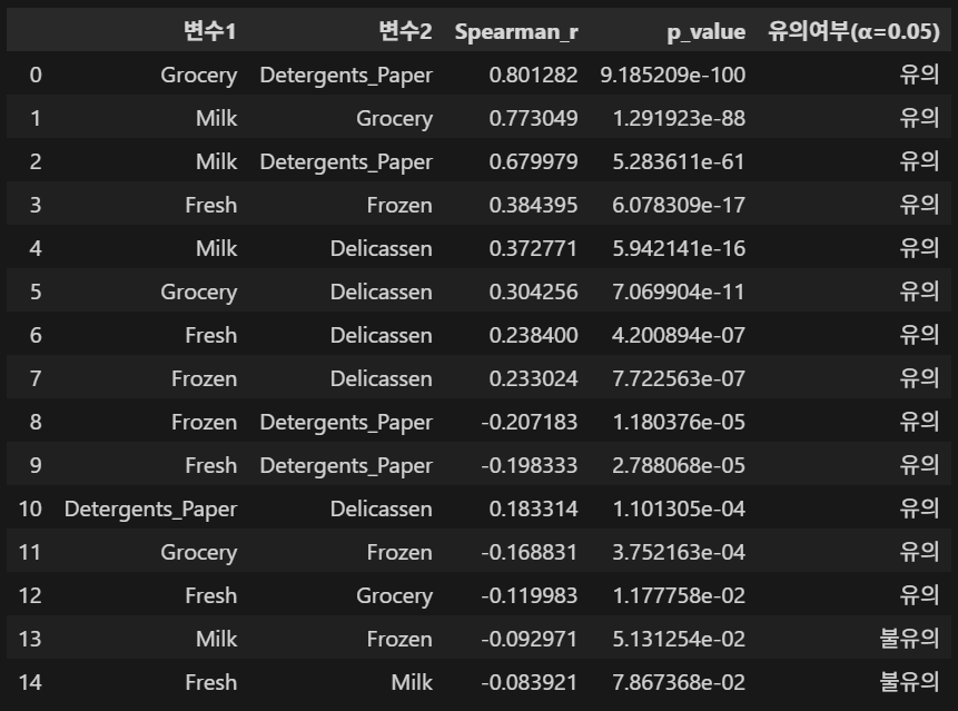 도출된 상관관계가 통계적으로 유의미한지 확인하기 위해 유의수준(α) 0.05를 기준으로 스피어만 순위 상관분석 기반의 가설 검정을 수행했습니다.