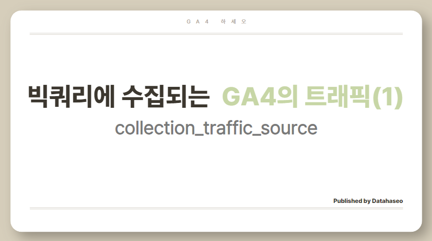 안녕하세요 데이터 하세오 :) 입니다!오늘은 'GA4 하세오' 글을 준비해봤는데,빅쿼리에 수집되는 GA4 의 트래픽 값들을 하나씩 알아보려 합니다.오늘 첫 번째 시리즈로는 collection_traffic_source 를 알아보겠습니다collection_traffic_source 란?빅쿼리 스키마 가이드에서 설명하는 해당 필드는 이벤트와 함께 수집된 트래픽 소스 데이터를 포함하는데요,https://support.google.com/analytics/answer/7029846필드 이름데이터 유형설명manual_campaign_id문자열이벤트와 함께 수집된 수동 캠페인 ID(utm_id)manual_campaign_name문자열이벤트와 함께 수집된 수동 캠페인 이름(utm_campaign)manual_sou..