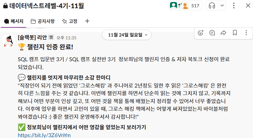 이렇게 마지막 글을 업로드 하고, 별도로 신청을 했더니 자동으로 봇이 인증 완료 + 신청 완료 알람을 보내줬다 ㅎㅎ