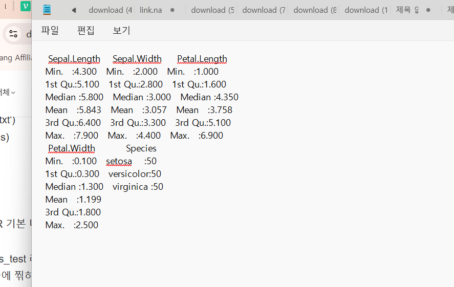 >> 이러면 R 기본 내장 데이터인 IRIS 데이터 셋의 기술 통계량을 외부파일 printa.txt 로 저장하는 것