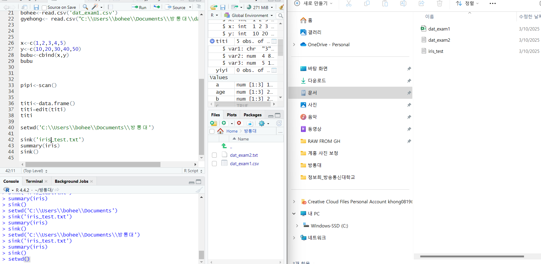 아래에서 iris_test 라는 파일을 방통대 경로에 sink 함수를 쓰면