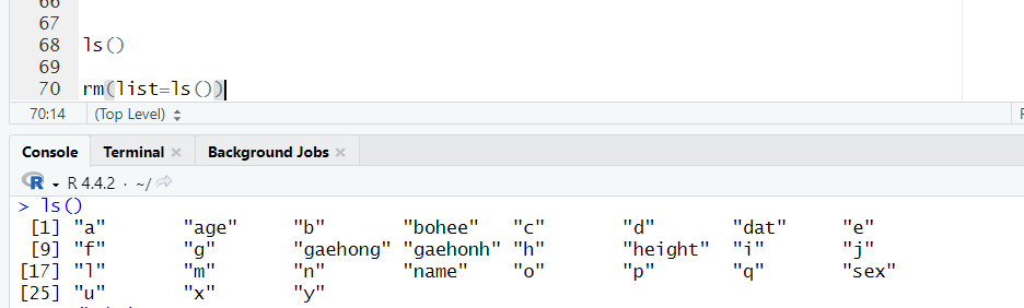 ls() 함수를이용하면 지금까지 만들어진 객체를 모두 확인 가능