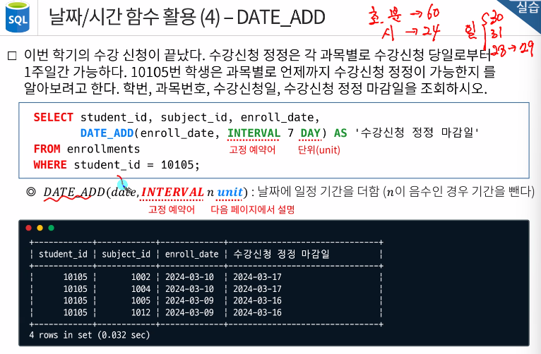 date_add(enroll_date, interval 7 day) as 정정마감일