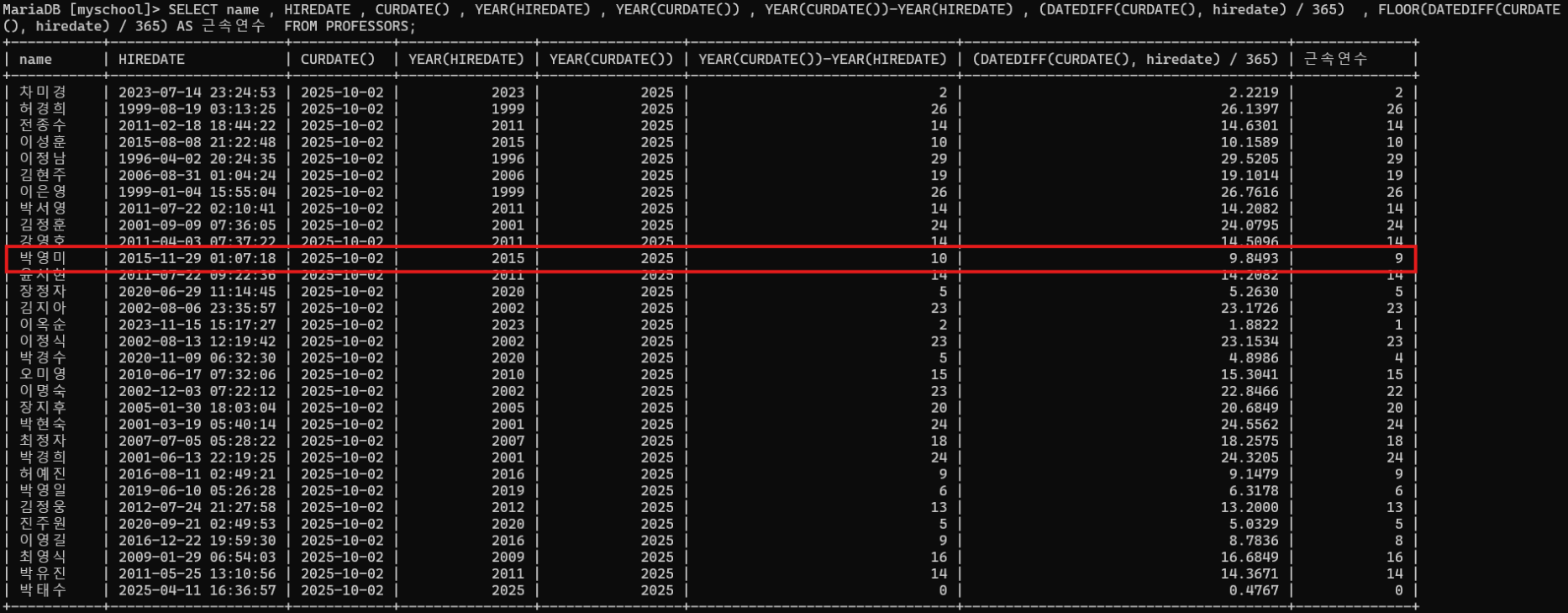 SELECT name , HIREDATE , CURDATE() , YEAR(HIREDATE) , YEAR(CURDATE()) , YEAR(CURDATE())-YEAR(HIREDATE) , (DATEDIFF(CURDATE(), hiredate) / 365) , FLOOR(DATEDIFF(CURDATE(), hiredate) / 365) AS 근속연수 FROM PROFESSORS;
