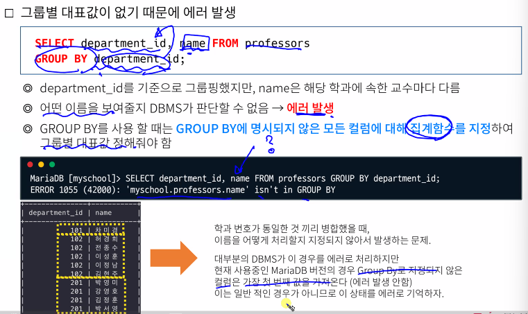 >>> GROUP BY 뒤에 있는 항목인데 SELECT 에 있고 집계된 항목이 없으면 에러