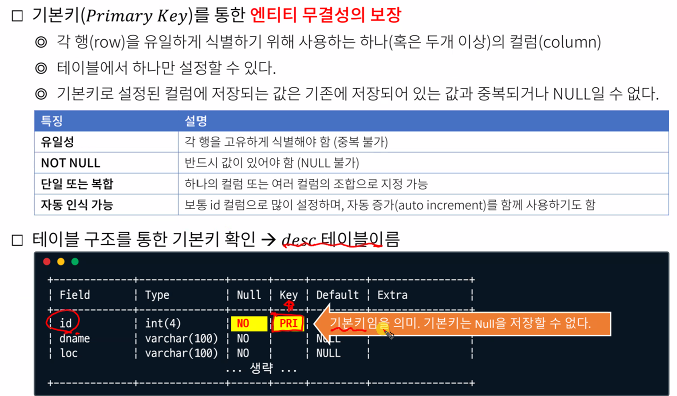 -기본키는 엔티티 무결성을 보장하며 NULL 불가