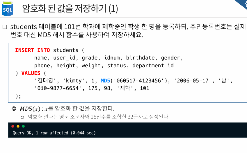-MD5 로 암호화하여 INSERT 가능하고, WHERE 절에서도 MD5 로 감싸서 조회해야함