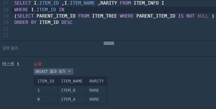 (1) 업그레이드 할 수 있었던 ITEM_ ID 들, 즉 PARENT_ITEM_ID 에 ID 가 존재한 항목들을 서브 쿼리로 추출
