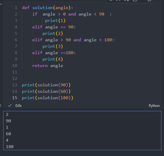 각에서 0도 초과 90도 미만은 예각, 90도는 직각, 90도 초과 180도 미만은 둔각 180도는 평각으로 분류합니다. 각 angle이 매개변수로 주어질 때 예각일 때 1, 직각일 때 2, 둔각일 때 3, 평각일 때 4를 return하도록 solution 함수를 완성해주세요.