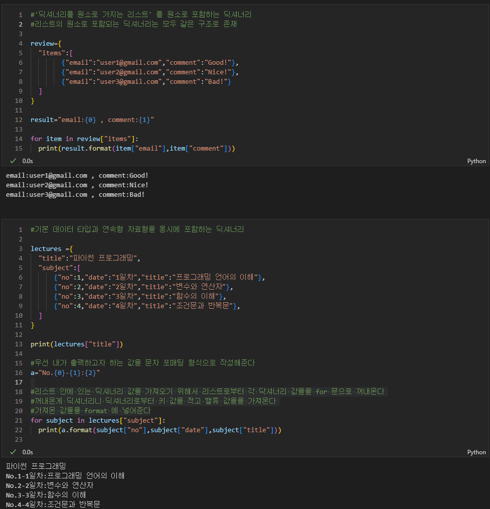 #'딕셔너리를 원소로 가지는 리스트' 를 원소로 포함하는 딕셔너리