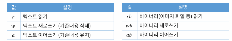 -'읽기 모드' 위치에는 아래와 같은 인자들을 쓸 수 있따