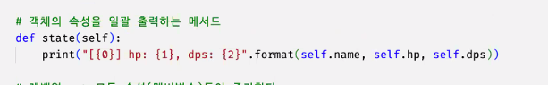 print("현재 체력은 {0}, 공격력은 {1}".format(self.hp,self.monster_power))
