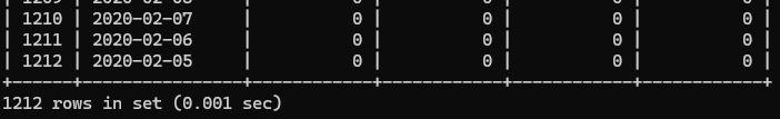 sql = text ("select DATE_FORMAT(collected_date,'%y-%m') as YEAR_MONTH_ ,SUM(seoul_sick) SUM_seoul_sick , SUM(seoul_dead) SUM_seoul_dead, SUM(korea_sick) SUM_korea_sick, SUM(korea_dead) SUM_korea_dead FROM covid19_test6 GROUP BY YEAR_MONTH_ ORDER BY YEAR_MONTH_")