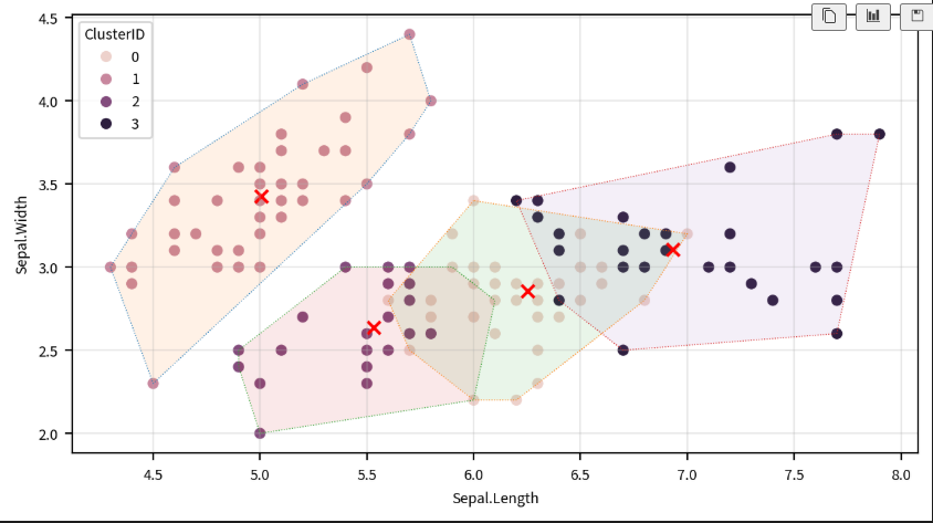 - 각 군집별로 색상을 칠해 경계선을 만들어주고, 각 군집의 중심점을 표현해줌